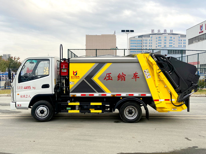 國六凱馬藍牌4.5方壓縮垃圾車凱馬藍牌壓縮垃圾車容積可達4.5方,實際裝載生活垃圾達60余桶,壓縮比高.●箱體外觀為圓弧...