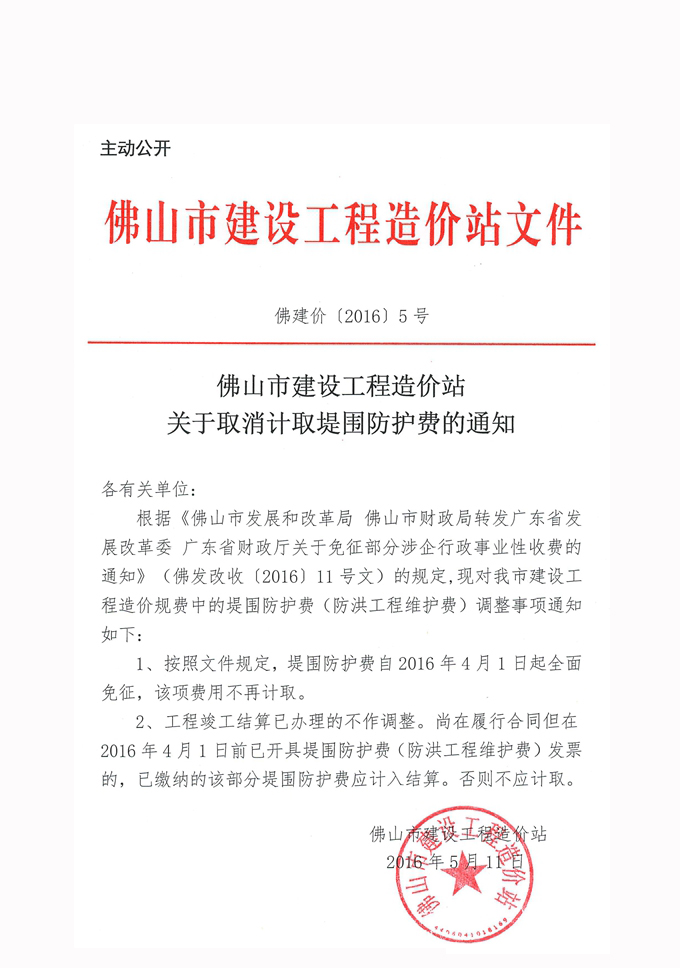 佛山市建設工程造價站關于取消計取堤圍防護費的通知
