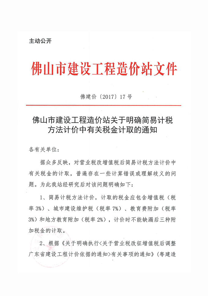 佛山市建設工程造價站關于明確簡易計稅方法計價中有關稅金計取的通知