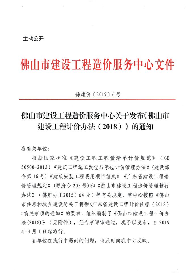 佛山市建設工程造價服務中心關于發布《佛山市建設工程計價辦法(2018)》的通知