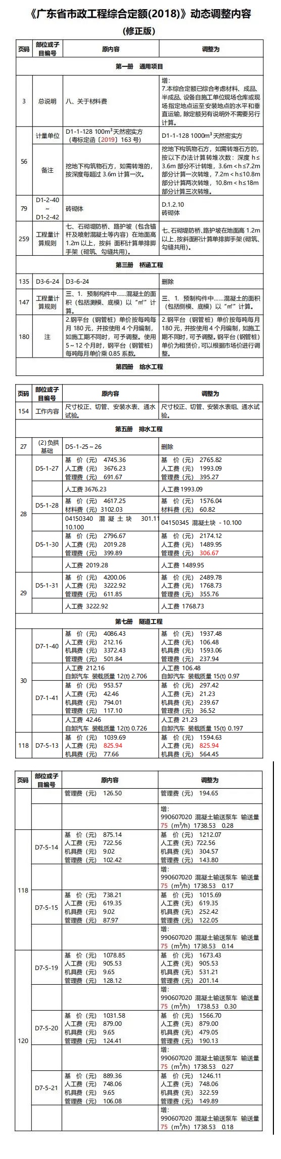 近期,我站組織專家研析了廣東省建設(shè)工程定額動態(tài)管理系統(tǒng)收集的反饋意見,現(xiàn)將《廣東省市政工程綜合定額(2018)》相關(guān)調(diào)整內(nèi)容印發(fā)給你們,調(diào)整內(nèi)容與我省現(xiàn)行工程計價依據(jù)配套使用,請遵照執(zhí)行。在執(zhí)行中遇到的問題,請通過“廣東省工程造價信息化平臺——建設(shè)工程定額動態(tài)管理系統(tǒng)”及時反映。