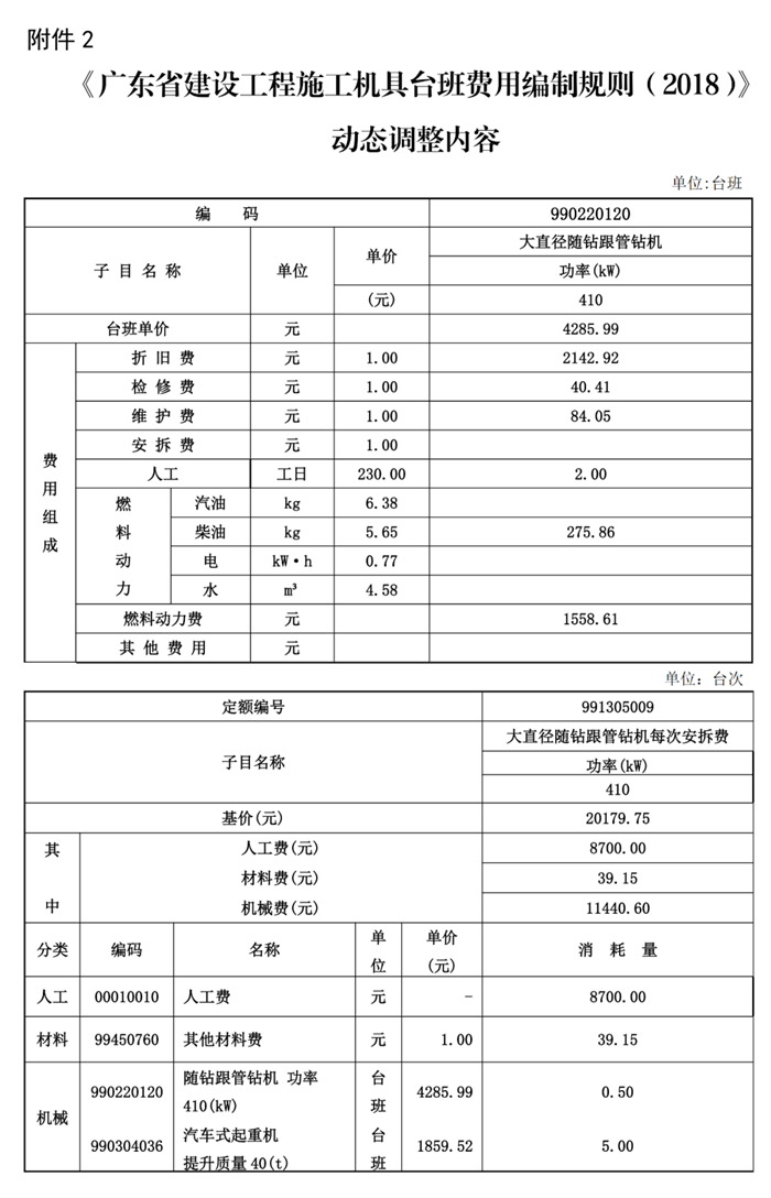 2.《廣東省建設工程施工機具臺班費用編制規則(2018)》調整內容