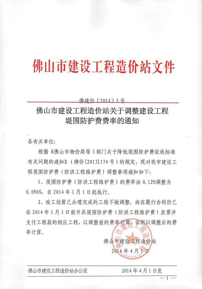 佛山市建設(shè)工程造價(jià)站關(guān)于調(diào)整建設(shè)工程堤圍防護(hù)費(fèi)費(fèi)率的通知
