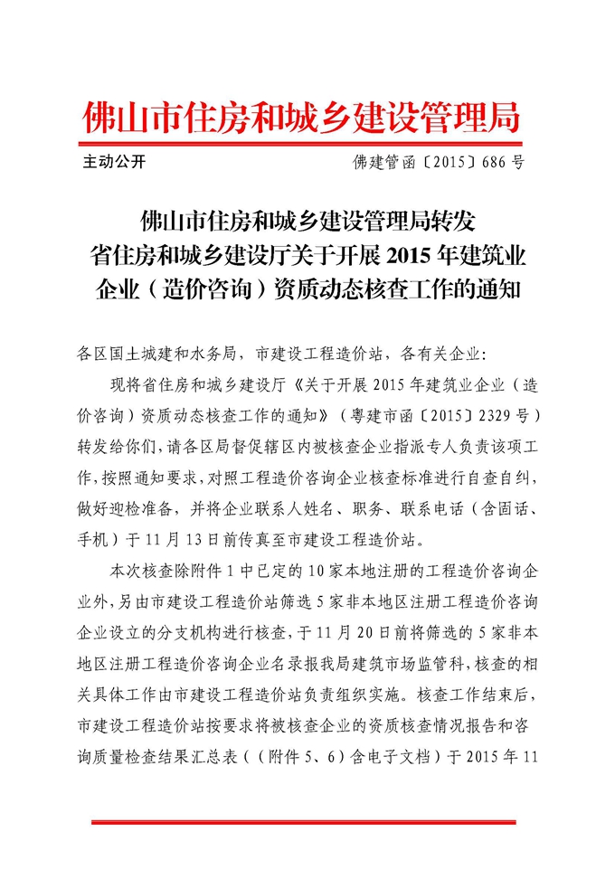 佛山市住房和城鄉建設管理局轉發省住房和城鄉建設廳關于開展2015年建筑業企業(造價咨詢)資質動態核查工作的通知