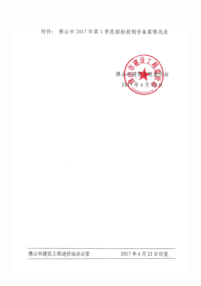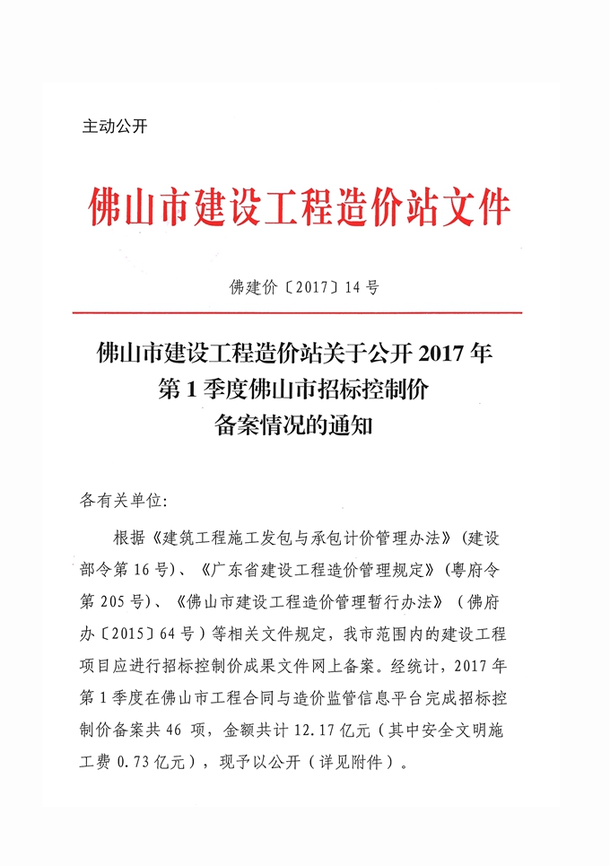 佛山市建設(shè)工程造價站關(guān)于公開2017年第1季度佛山市招標(biāo)控制價備案情況的通知