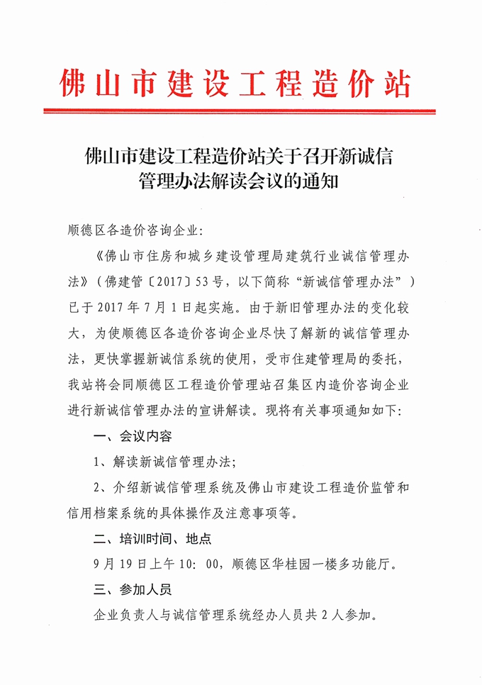 佛山市建設工程造價站關于召開新誠信管理辦法解讀會議的通知