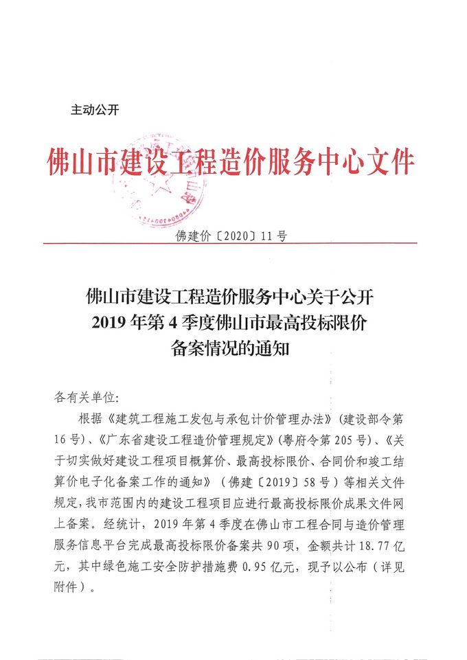 佛山市建設工程造價服務中心關于公開2019年第4季度佛山市最高投標限價備案情況的通知
