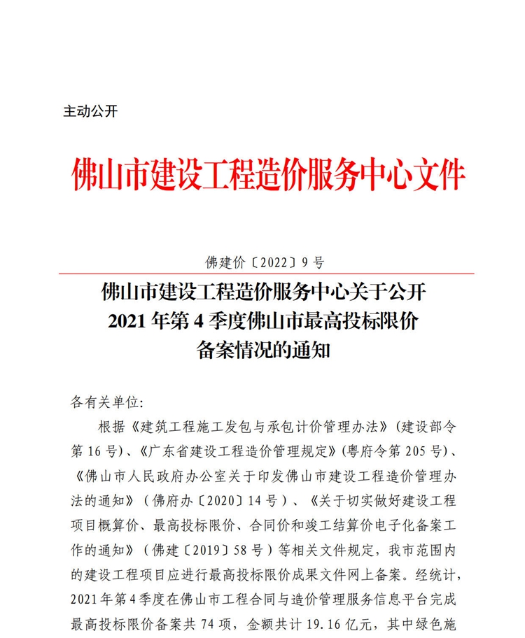 佛山市建設工程造價服務中心關于公開2021年第4季度佛山市最高投標限價備案情況的通知