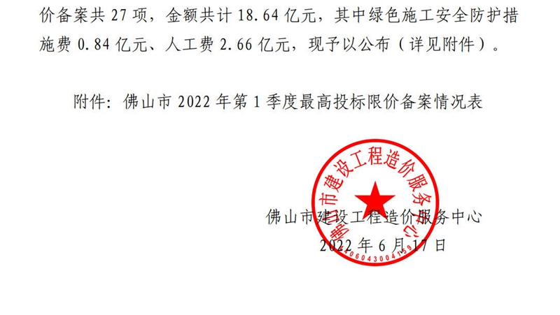 佛山市建設工程造價服務中心關于公開2022年第1季度佛山市最高投標限價備案情況的通知