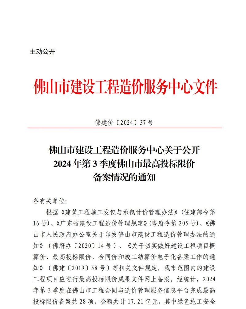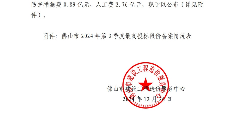 轉發 | 佛山市建設工程造價服務中心關于公開2024年第3季度佛山市最高投標限價備案情況的通知