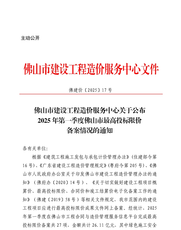轉(zhuǎn)發(fā) | 佛山市建設(shè)工程造價服務(wù)中心關(guān)于公布2025年第一季度佛山市最高投標(biāo)限價備案情況的通知