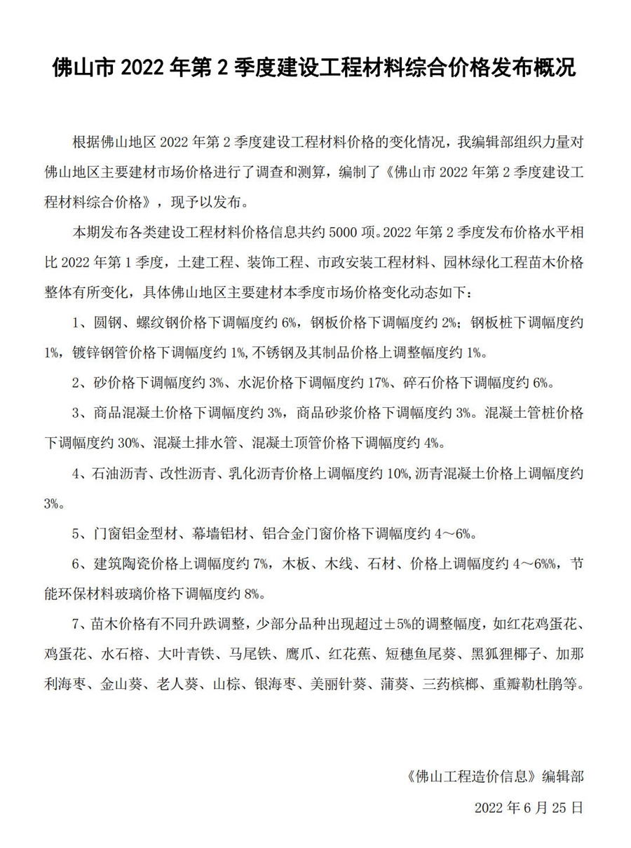 佛山市2022年第2季度建設(shè)工程材料綜合價格發(fā)布概況