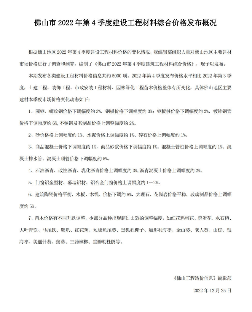 佛山市2022年第4季度建設(shè)工程材料綜合價格發(fā)布概況