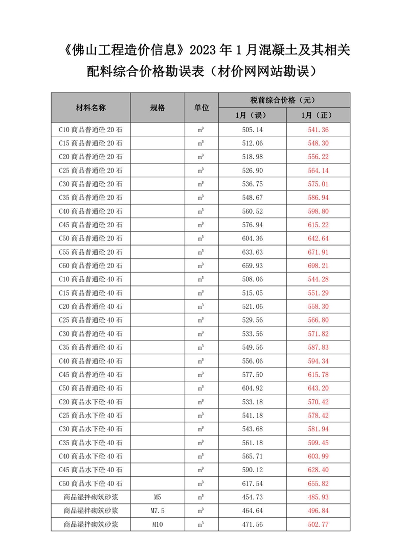 《佛山工程造價信息》2023年1月混凝土及其相關配料綜合價格勘誤表(材價網網站勘誤)