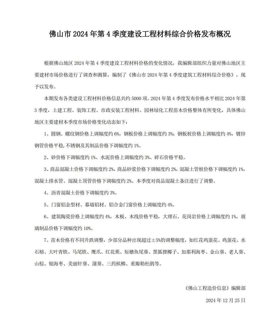 佛山市2024年第4季度建設工程材料綜合價格發布概況