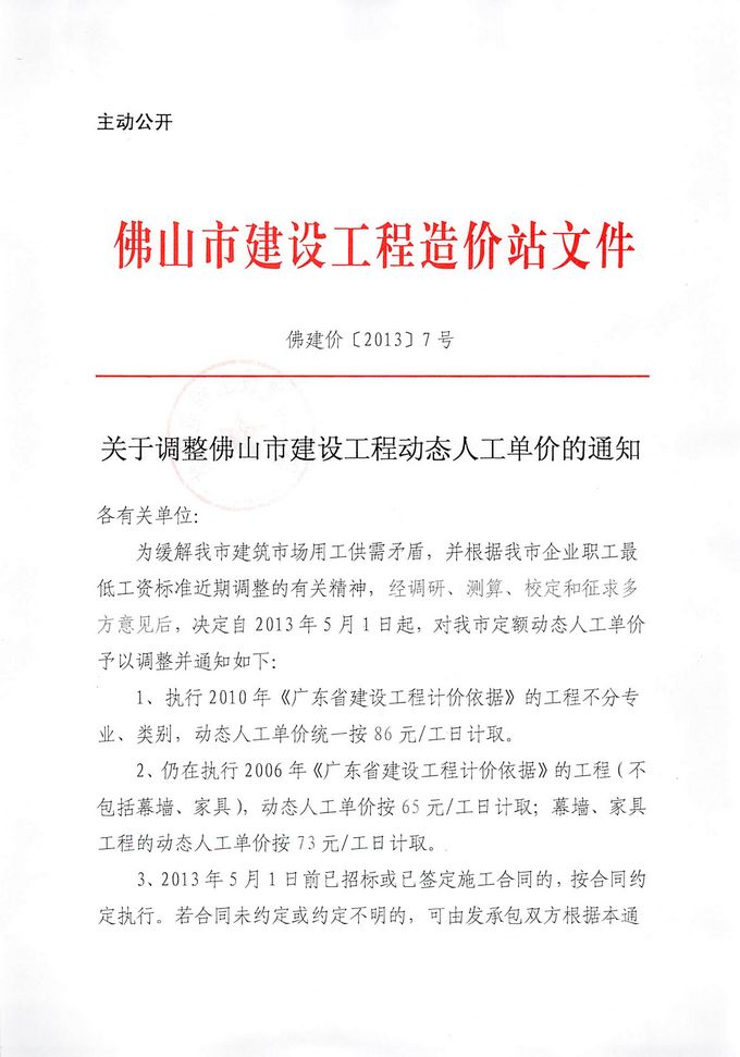 關(guān)于調(diào)整佛山市建設(shè)工程動態(tài)人工單價的通知