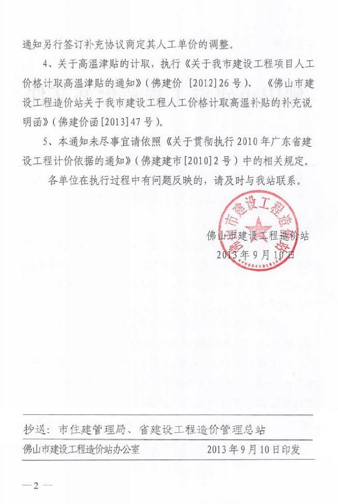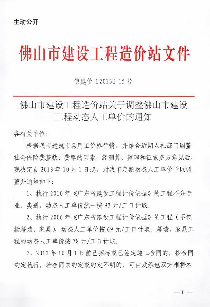 佛山市建設工程造價站關于調整佛山市建設工程動態人工單價的通知