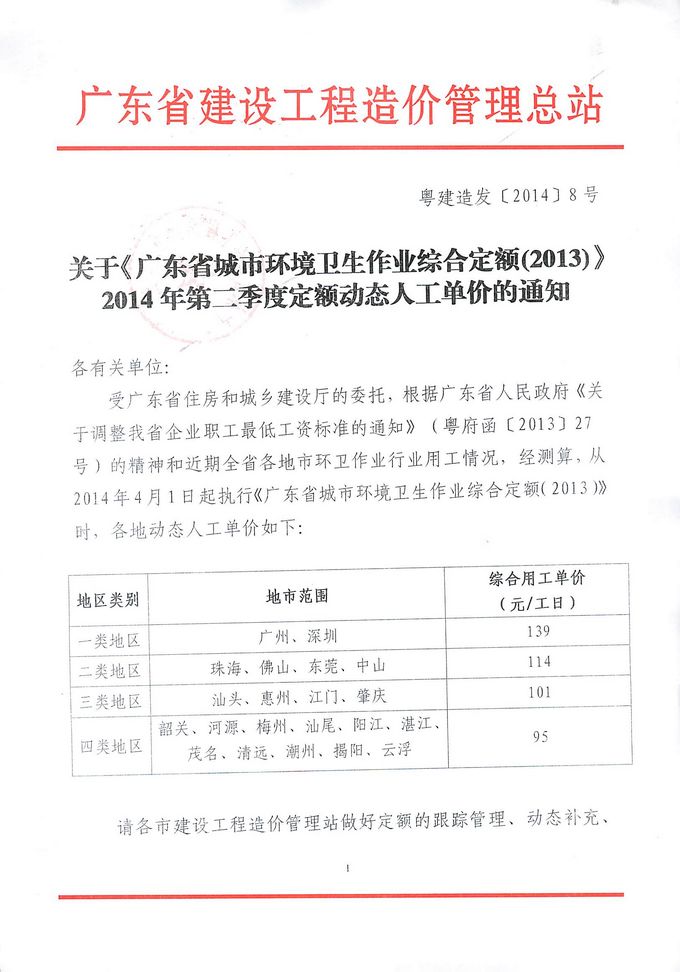 關(guān)于《廣東省城市環(huán)境衛(wèi)生作業(yè)綜合定額(2013)》2014年第二季度定額動(dòng)態(tài)人工單價(jià)的通知