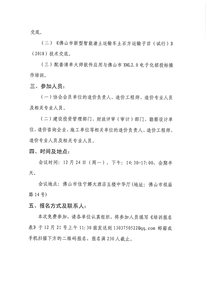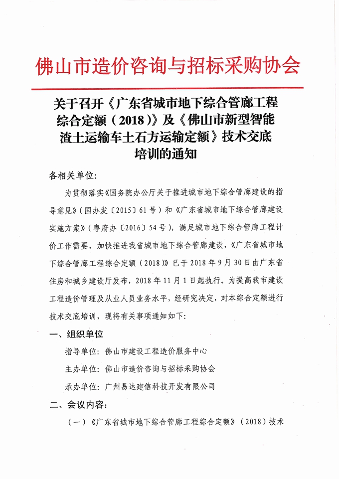 關(guān)于召開《廣東省城市地下綜合管廊工程綜合定額(2018)》及《佛山市新型智能渣土運輸車土石方運輸定額》技術(shù)交底培訓(xùn)的通知