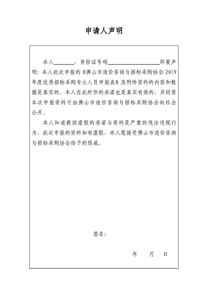 附件4、佛山市造價咨詢與招標采購協會2019年度優秀招標采購專業人員申 報 表