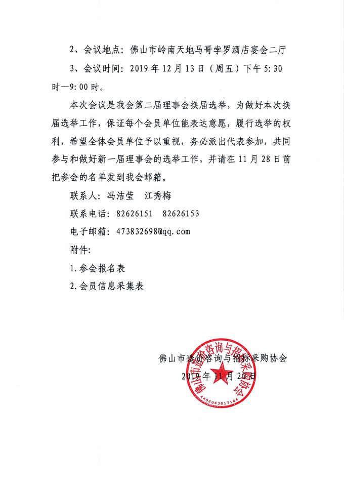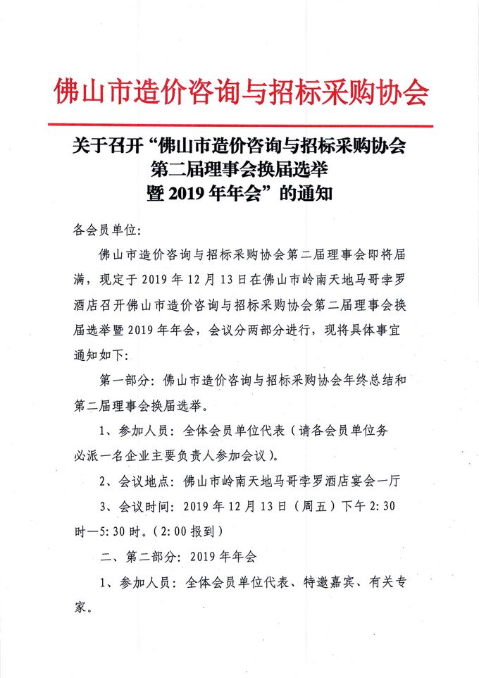 關于召開“佛山市造價咨詢與招標采購協會第二屆理事會換屆選舉暨2019年年會”的通知