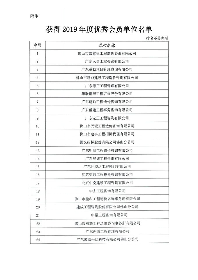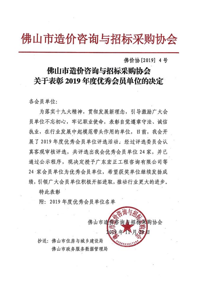 佛山市造價咨詢與招標采購協會關于表彰2019年度優秀會員單位的決定