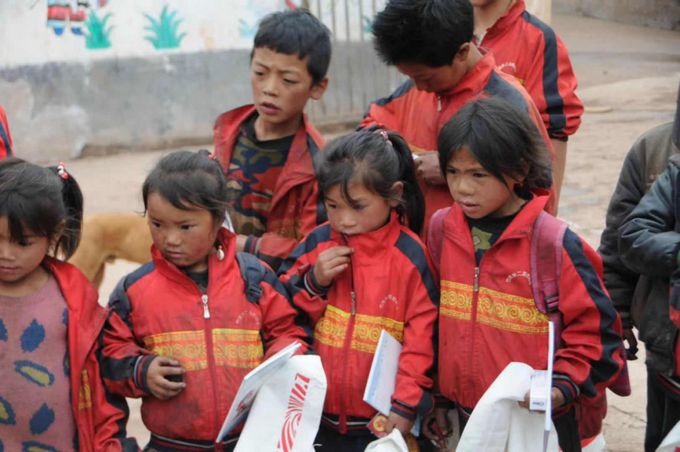 依楚村的孩子們拿著慰問團(tuán)送來的學(xué)習(xí)用品