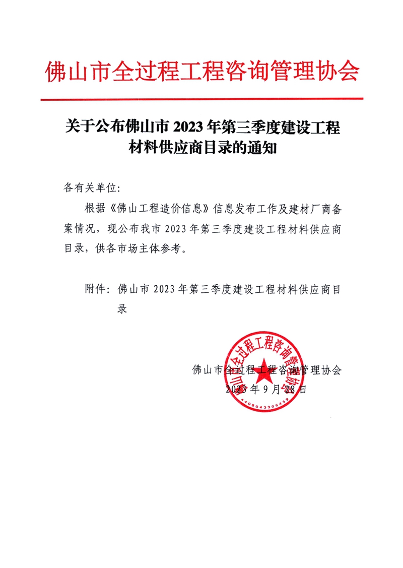 關(guān)于公布佛山市2023年第三季度建設(shè)工程材料供應(yīng)商目錄的通知