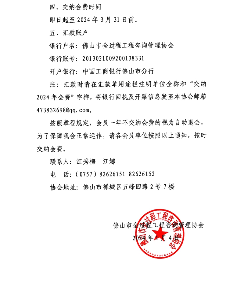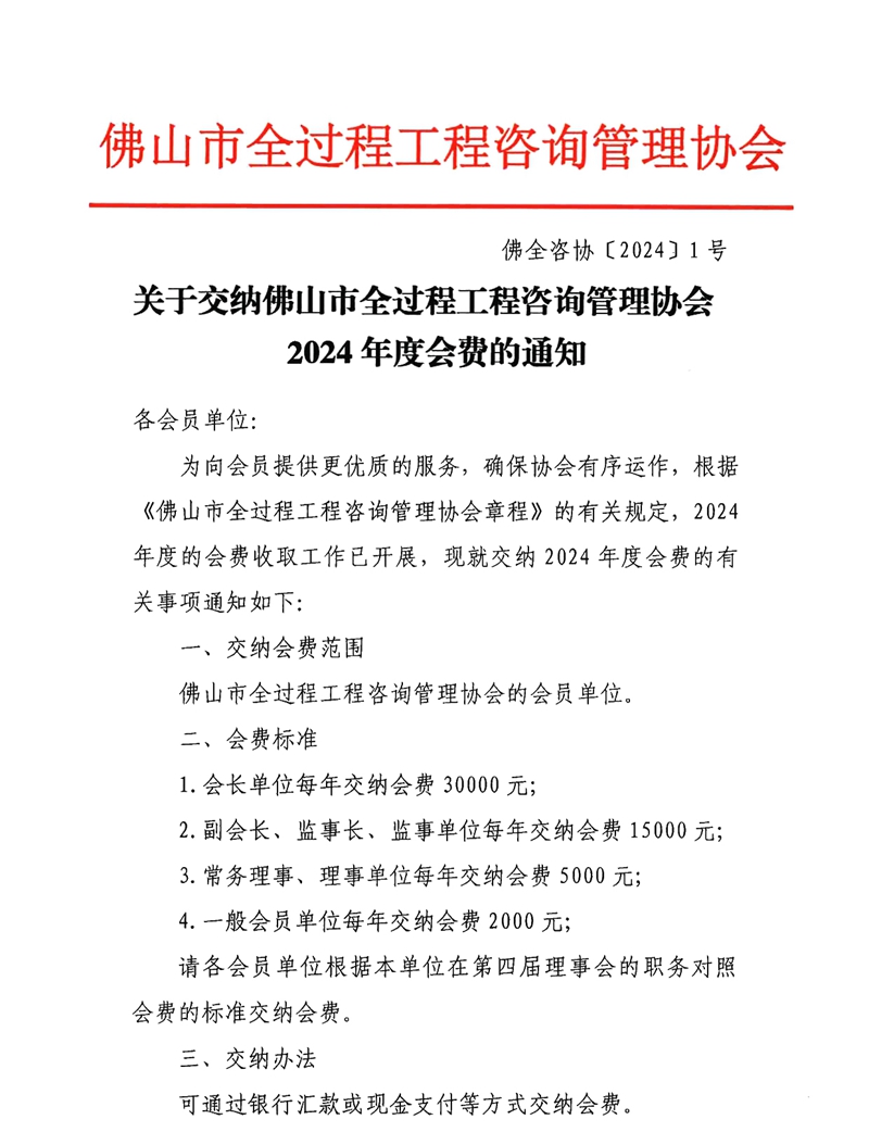 關(guān)于交納佛山市全過程工程咨詢管理協(xié)會(huì)2024年度會(huì)費(fèi)的通知