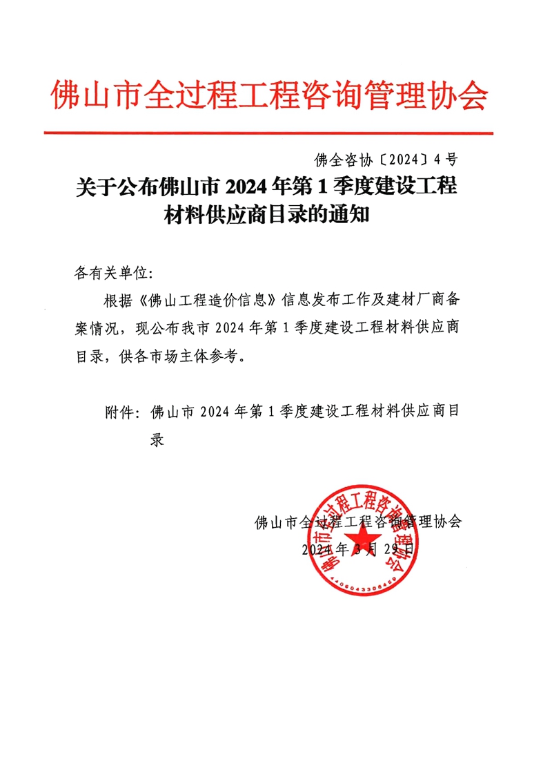 關于公布佛山市2024年第1季度建設工程材料供應商目錄的通知