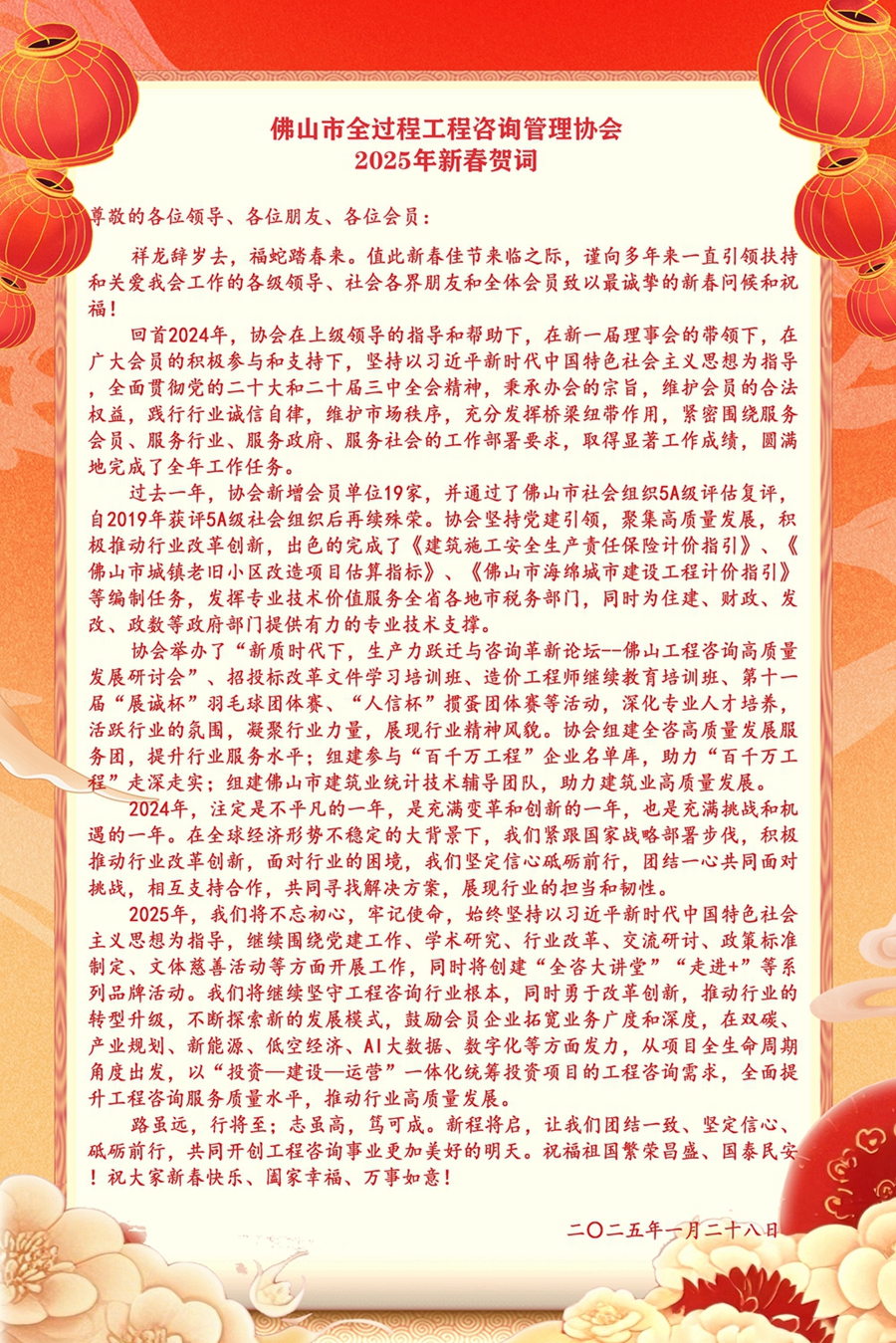 新春賀詞 | 佛山市全過(guò)程工程咨詢管理協(xié)會(huì)恭祝大家新春快樂(lè),蛇年大吉!
