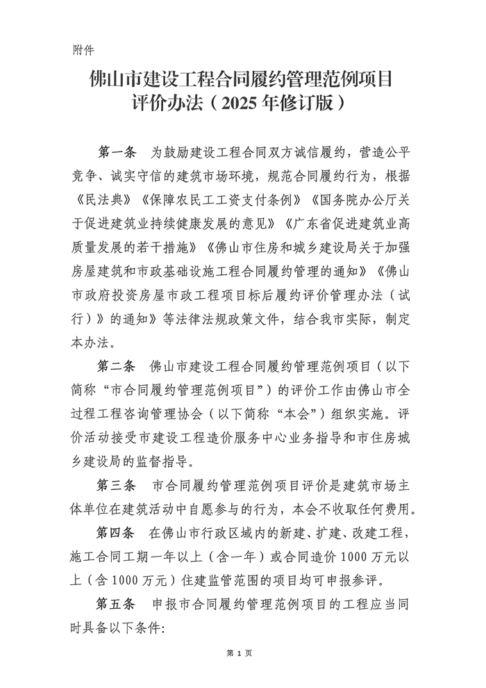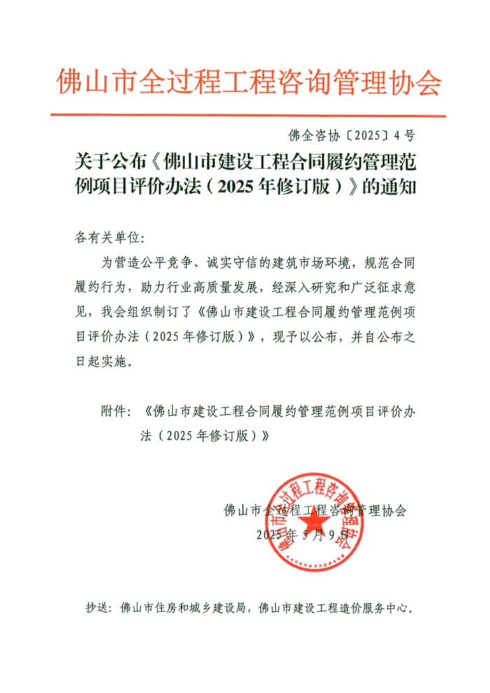 關于公布《佛山市建設工程合同履約管理范例項目評價辦法(2025年修訂版)》的通知