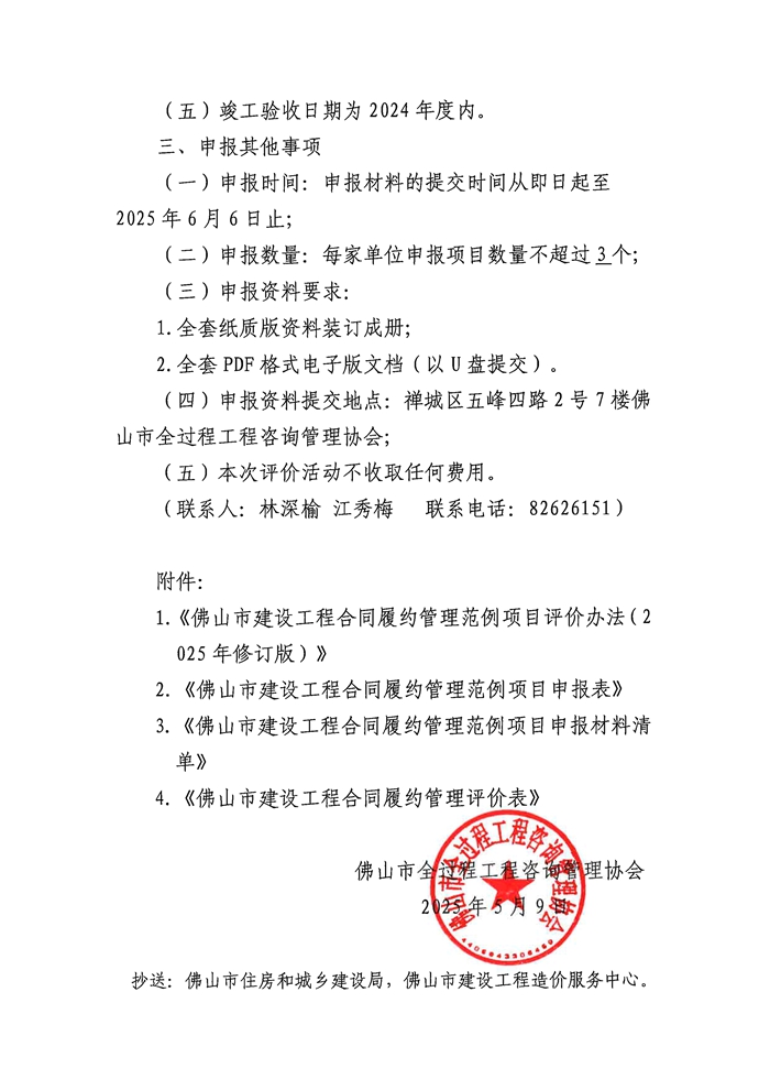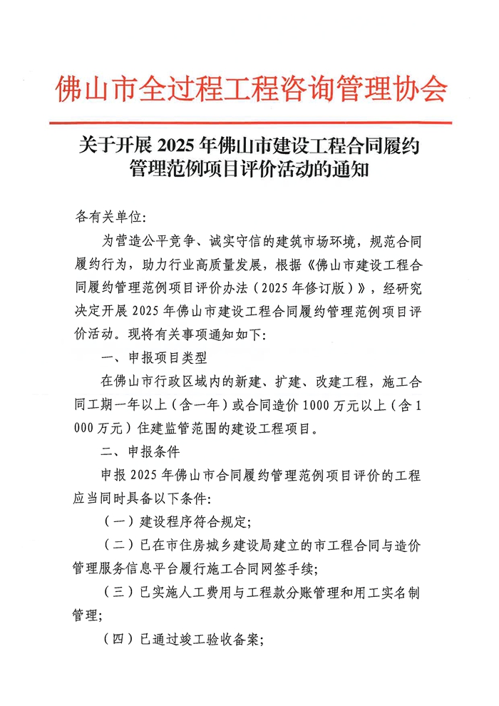 關(guān)于開展2025年佛山市建設(shè)工程合同履約管理范例項目評價活動的通知