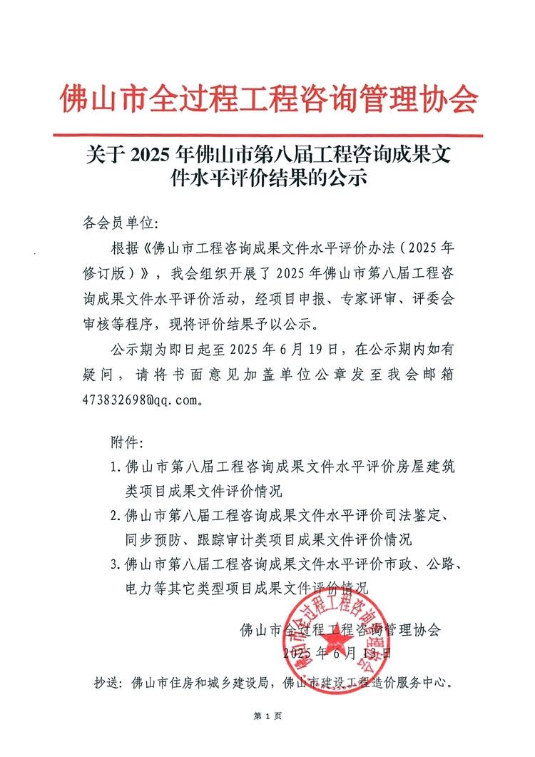 關于2025年佛山市第八屆工程咨詢成果文件水平評價結果的公示