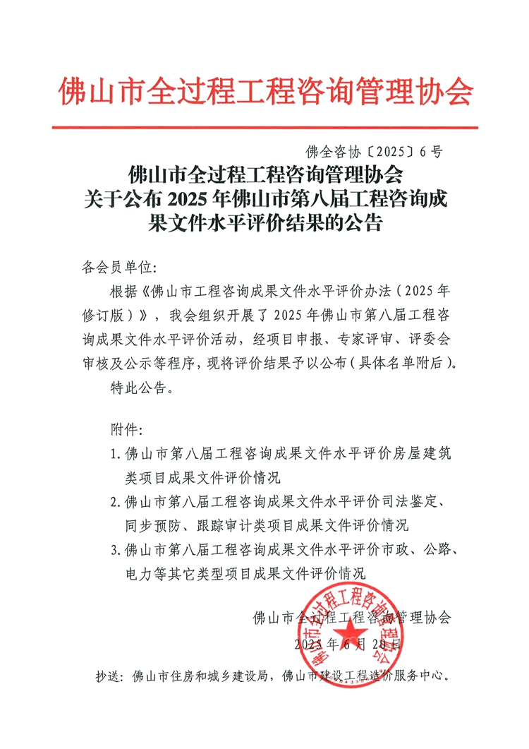 佛山市全過(guò)程工程咨詢管理協(xié)會(huì)關(guān)于公布2025年佛山市第八屆工程咨詢成果文件水平評(píng)價(jià)結(jié)果的公告