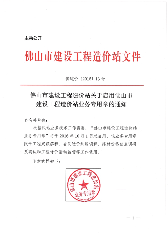 佛山市建設工程造價站關于啟用佛山市建設工程造價站業務專用章的通知