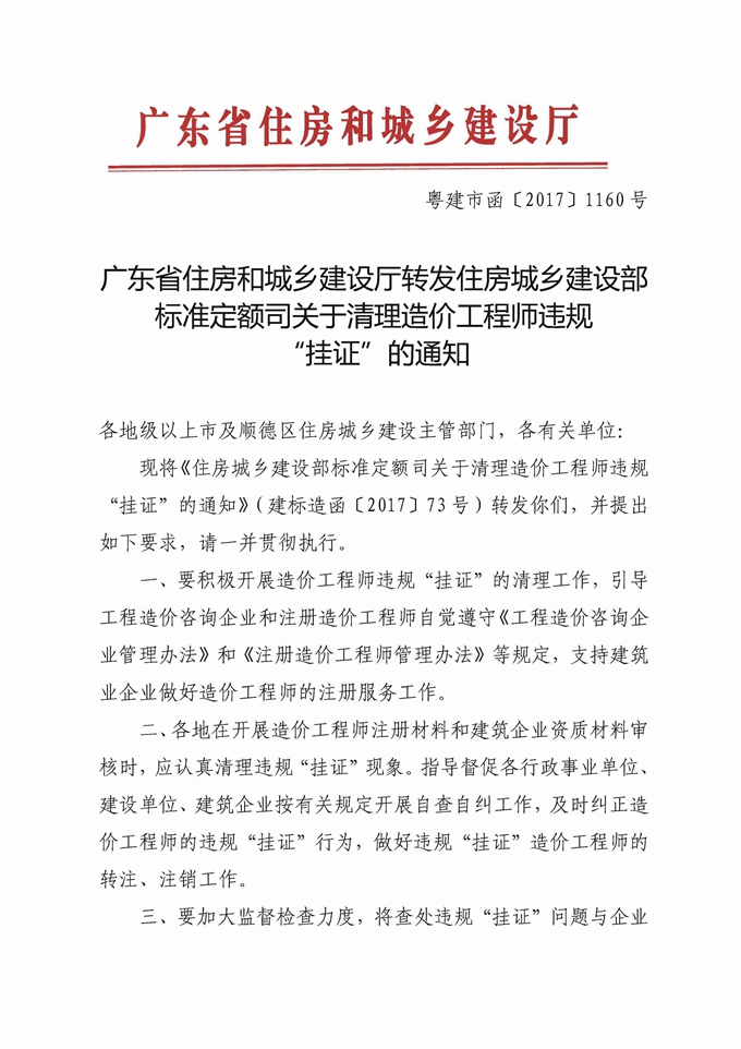 廣東省住房和城鄉(xiāng)建設(shè)廳轉(zhuǎn)發(fā)住房城鄉(xiāng)建設(shè)部標(biāo)準(zhǔn)定額司關(guān)于清理造價工程師違規(guī)“掛證”的通知