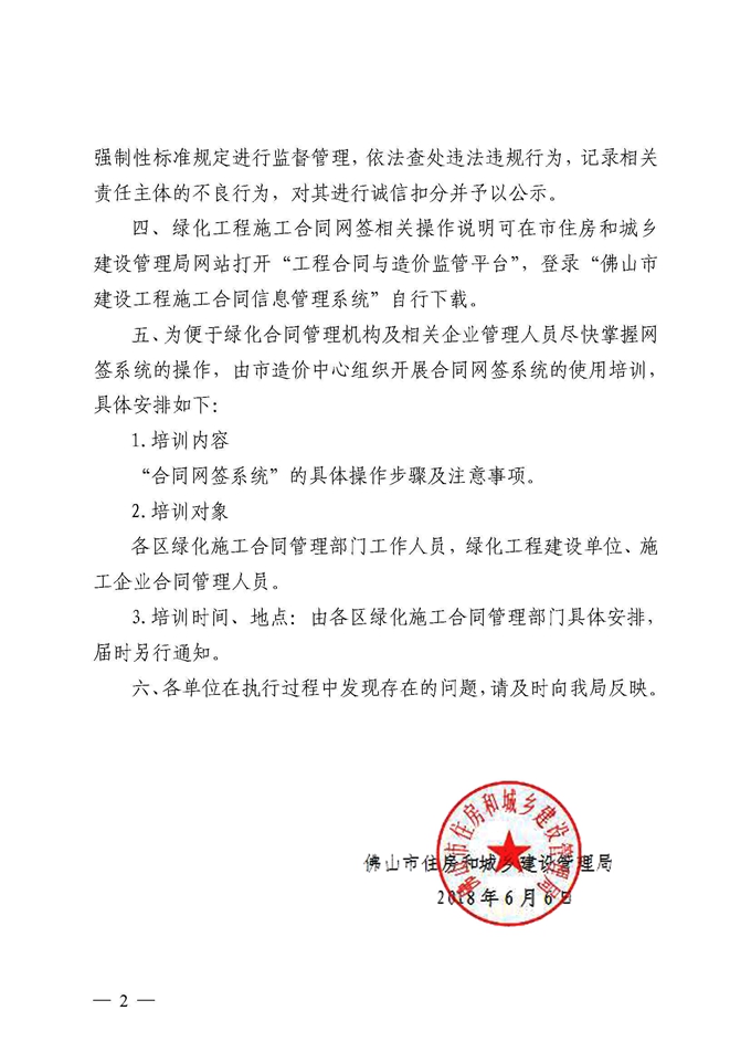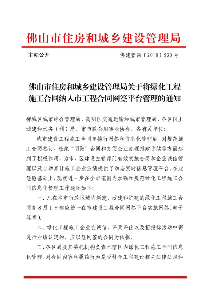 佛山市住房和城鄉建設管理局關于將綠化工程施工合同納入市工程合同網簽平臺管理的通知