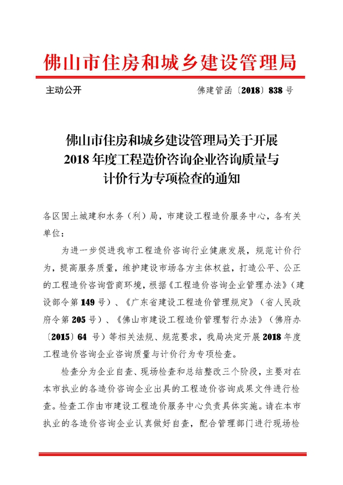 佛山市住房和城鄉建設管理局關于開展2018年度工程造價咨詢企業咨詢質量與計價行為專項檢查的通知