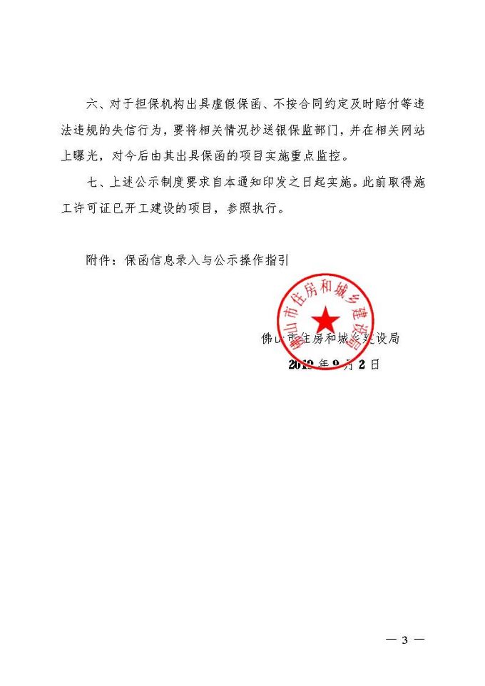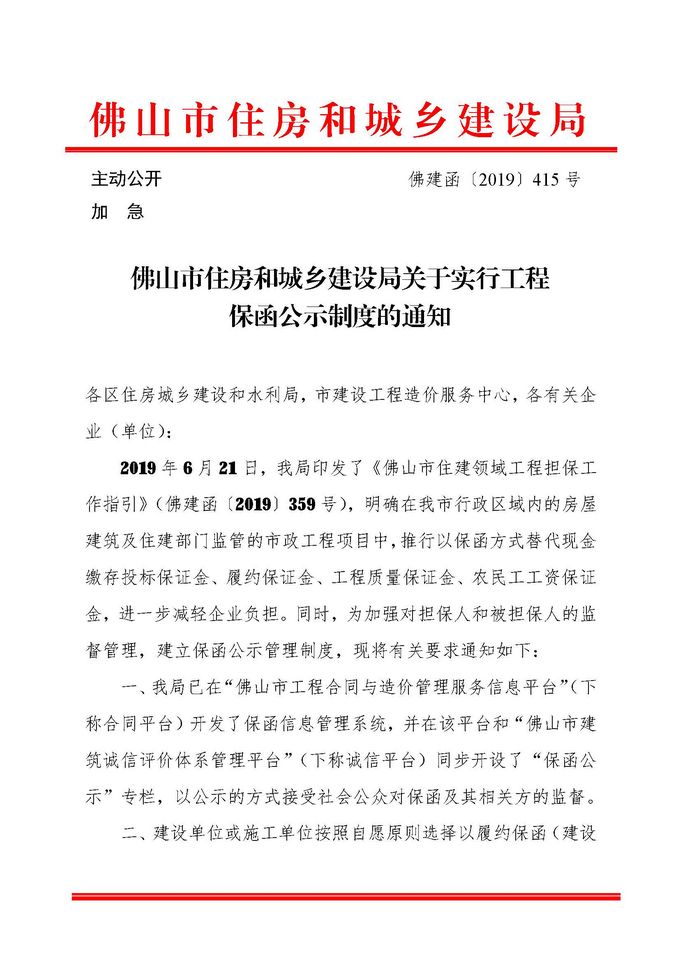 佛山市住房和城鄉建設局關于實行工程保函公示制度的通知