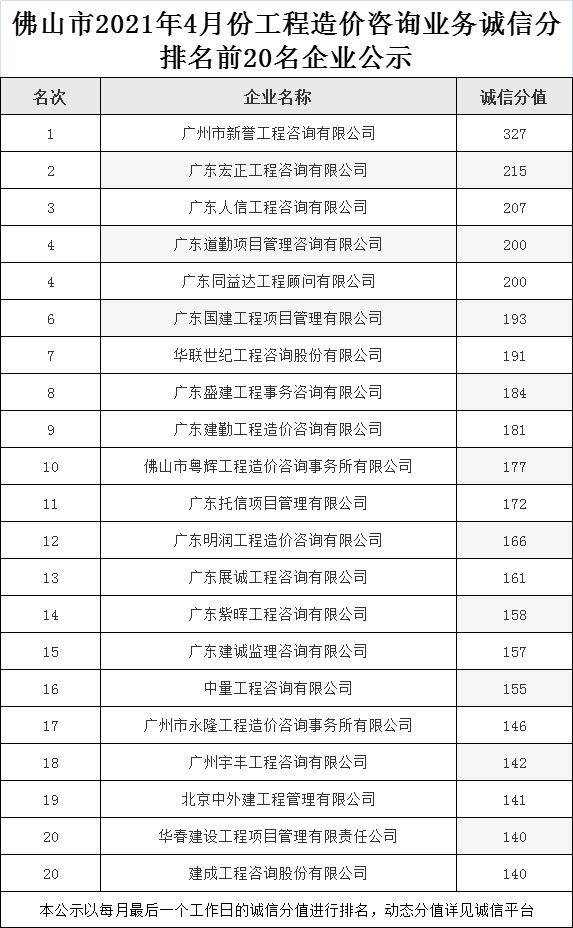 佛山市2021年4月份工程造價咨詢業務誠信分排名前20名企業公示