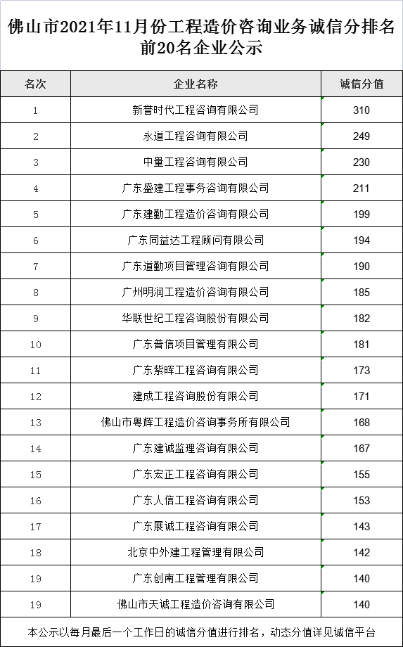 佛山市2021年11月份工程造價咨詢業務誠信分排名前20名企業公示