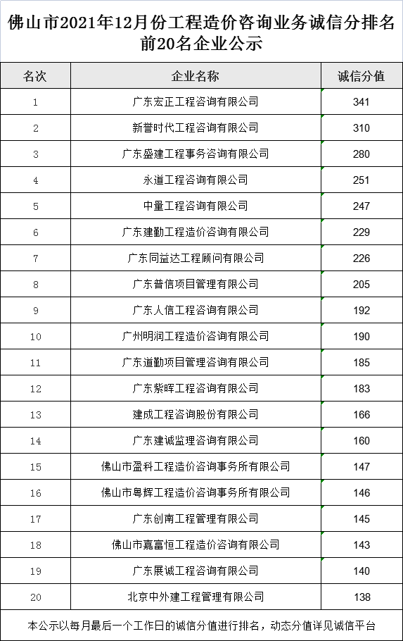 佛山市2021年12月份工程造價咨詢業務誠信分排名前20名企業公示