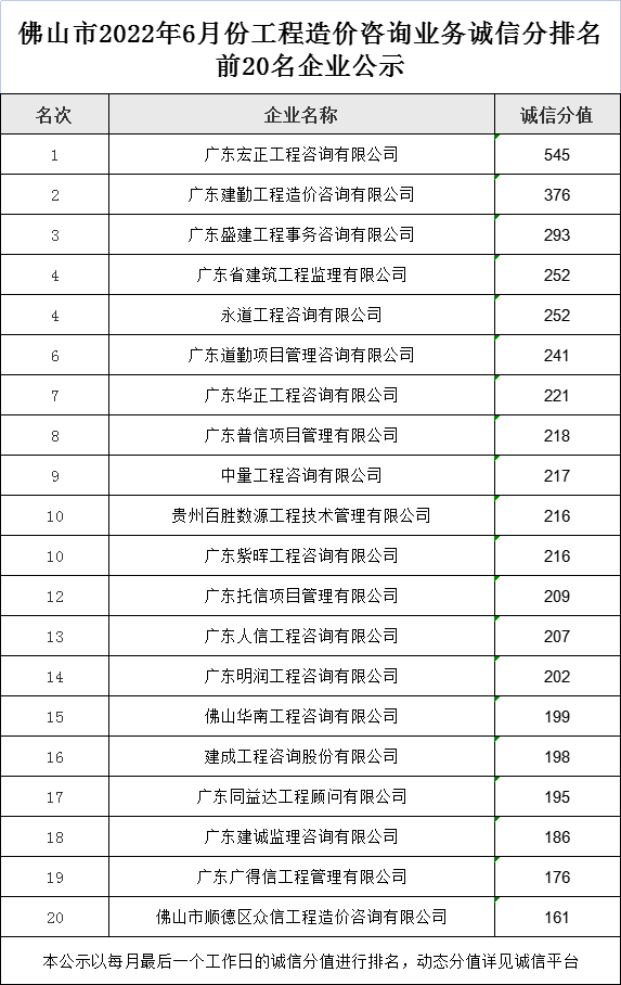 佛山市2022年6月份工程造價(jià)咨詢業(yè)務(wù)誠信分排名前20名企業(yè)公示