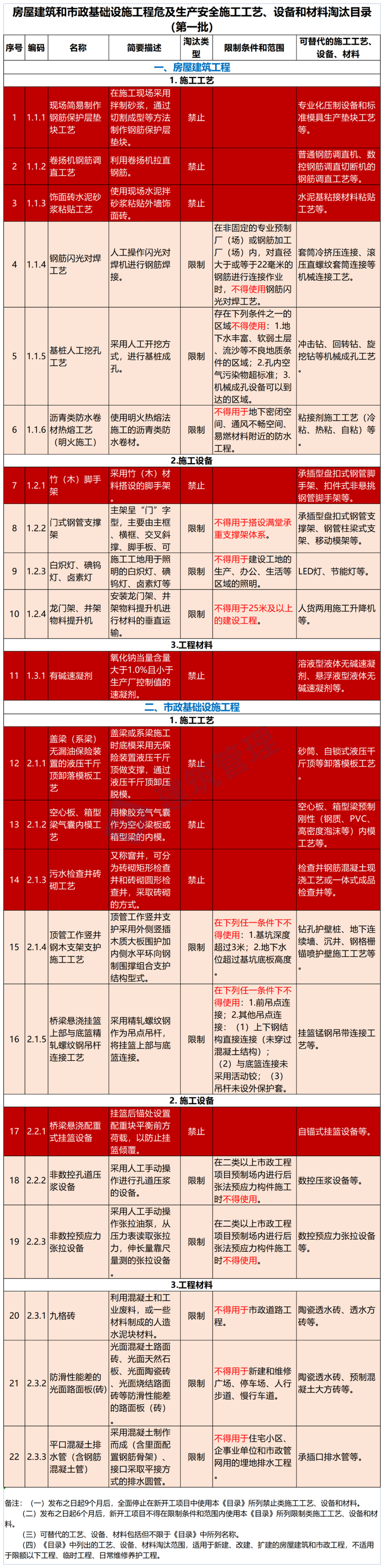 2021年12月14日,住建部印發(fā)的《房屋建筑和市政基礎(chǔ)設(shè)施工程危及生產(chǎn)安全施工工藝、設(shè)備和材料淘汰目錄(第一批)》明確: