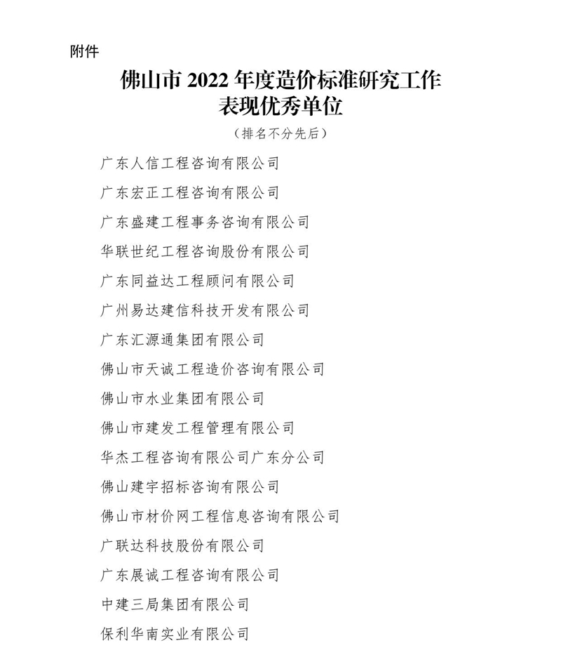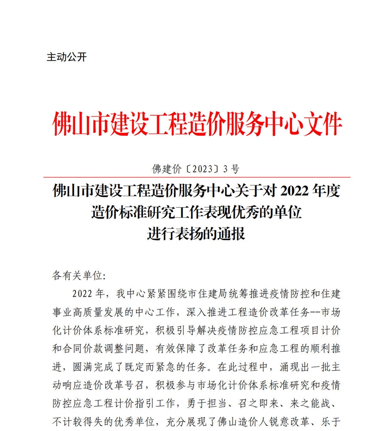 轉發 | 佛山市建設工程造價服務中心關于對2022年度造價標準研究工作表現優秀的單位進行表揚的通報