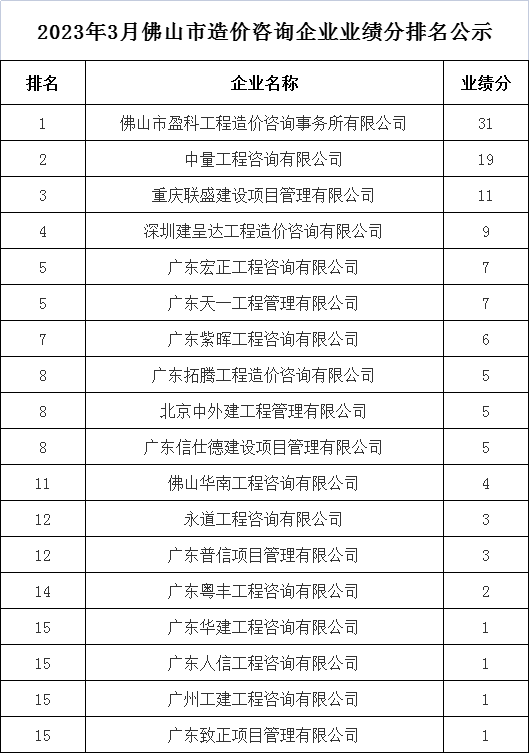 2023年3月佛山市造價咨詢企業(yè)業(yè)績分排名公示