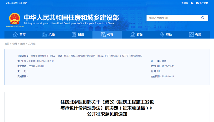 轉(zhuǎn)發(fā) | 住房城鄉(xiāng)建設(shè)部關(guān)于《修改〈建筑工程施工發(fā)包與承包計(jì)價(jià)管理辦法〉的決定(征求意見稿)》公開征求意見的通知