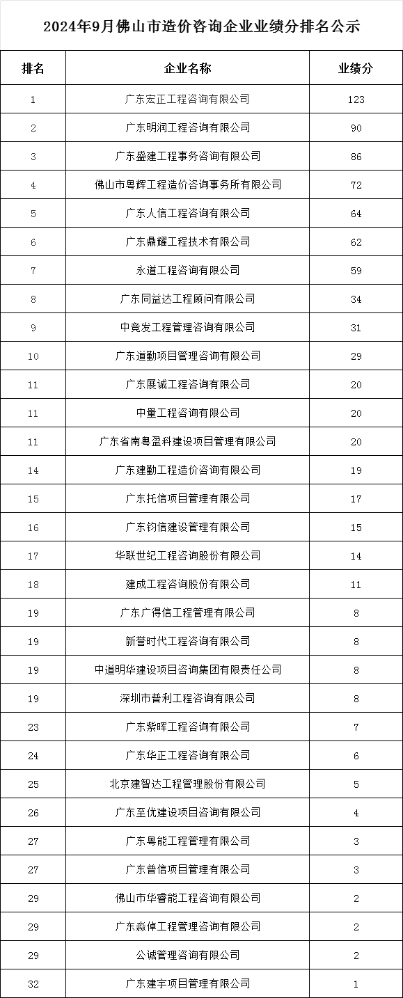 轉(zhuǎn)發(fā) | 2024年9月佛山市造價咨詢企業(yè)業(yè)績分排名公示