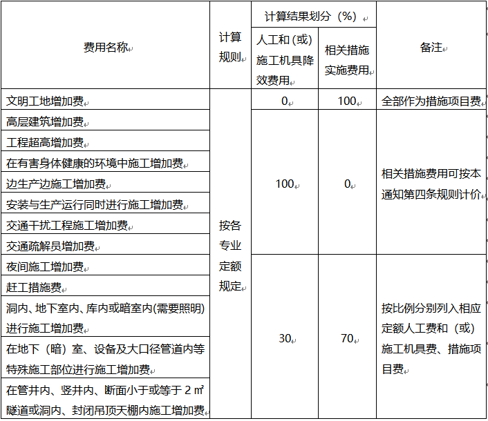 例如,①工程超高增加費:下表顯示全部屬于人工和(或)施工機具降效費用,因其計算基礎為人工費,則工程超高增加費全部為人工降效費用,在執行相應定額時即可將定額人工費乘以工程超高增加費費率進行計算,并參與計取管理費和利潤。②趕工措施費:下表顯示按相關專業定額規定計算結果的30%為人工和(或)施工機具降效費用,因其計算基礎為(人工費+施工機具費),則趕工措施費的30%為人工和施工機具降效費用,在執行相應定額時即可將定額人工費、施工機具費分別乘以趕工措施費費率的30%進行計算,并參與計取管理費和利潤,而按相關專業定額規定計算結果的70%作為相關措施實施費用放入趕工措施費。③文明工地增加費:下表顯示全部屬于相關措施實施費用,即為文明工地措施費。